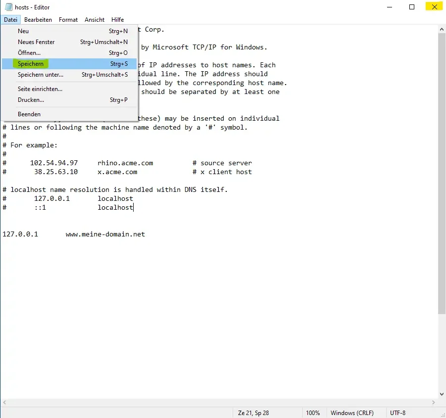 4. now you have the file open and can add your host entry. In this case the IP "127.0.0.1" now points to the domain "www.meine-domain.net".