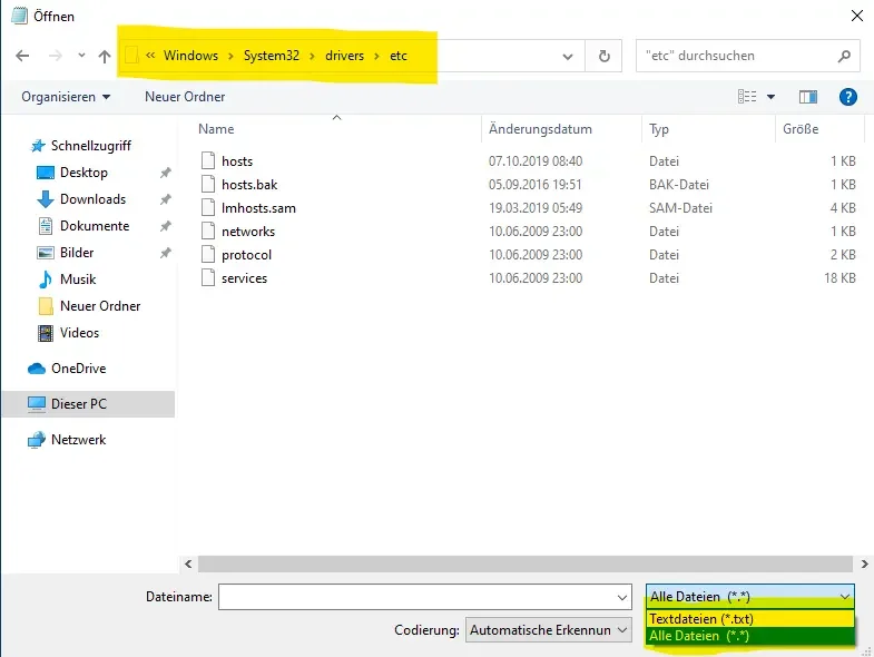 3. navigate to "C:\Windows\System32\driver\etc" and make sure that "All files (.)" is selected in the bottom left corner