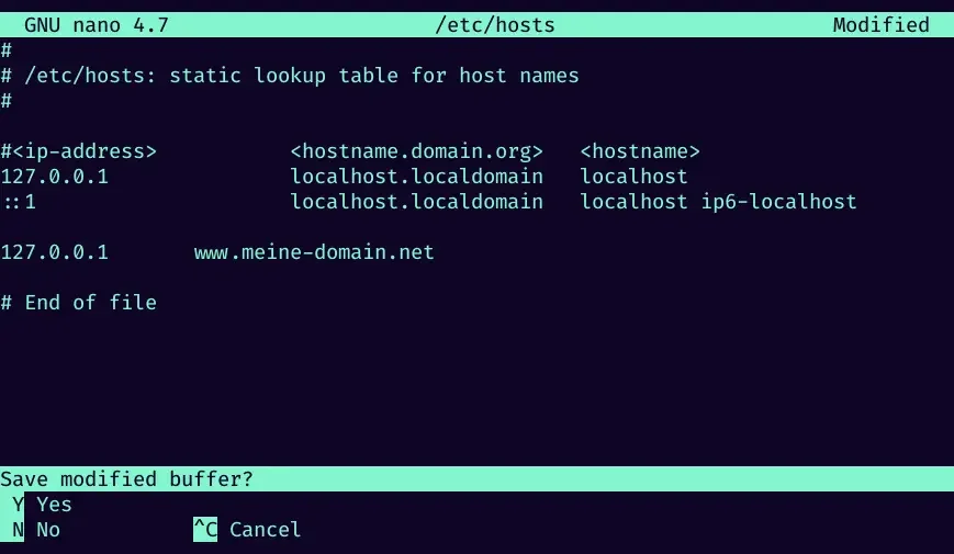 3. you are now in the text editor. navigate down with the arrow keys and enter your desired hosts entry. In this case, the IP "127.0.0.1" now points to the domain "www.meine-domain.net". After you have added the entry, press the keyboard combination: "Ctrl + X".