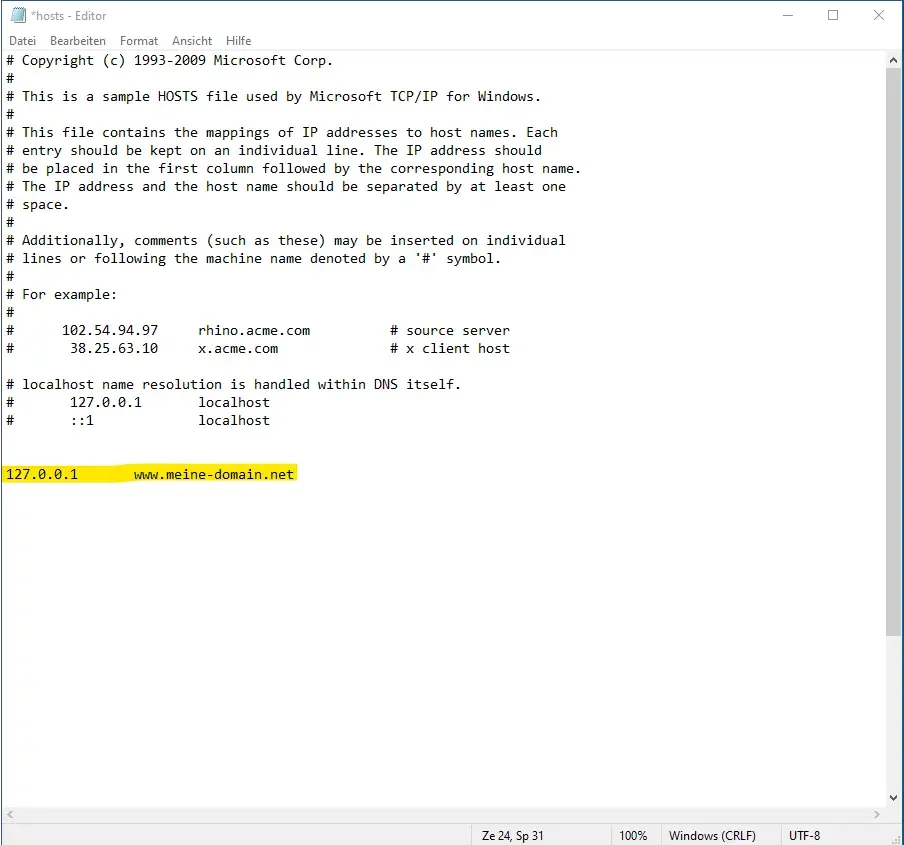 4. now you have the file open and can add your host entry. In this case the IP "127.0.0.1" now points to the domain "www.meine-domain.net".