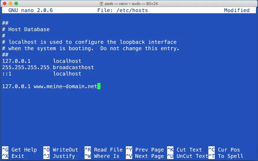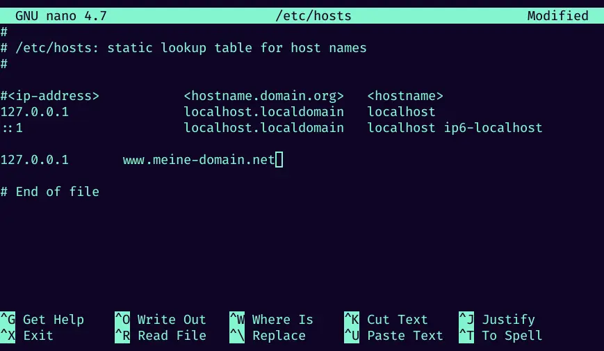 3. you are now in the text editor. navigate down with the arrow keys and enter your desired hosts entry. In this case, the IP "127.0.0.1" now points to the domain "www.meine-domain.net". After you have added the entry, press the keyboard combination: "Ctrl + X".