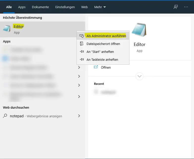 Then click on the editor with the right mouse button and click on "Run as administrator" on the left.