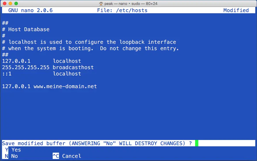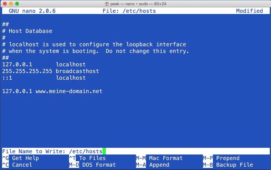 2. you are now in the text editor. navigate down with the arrow keys and enter your desired hosts entry. In this case, the IP "127.0.0.1" now points to the domain "www.meine-domain.net". After you have added the entry, press the keyboard combination: "Ctrl + X".